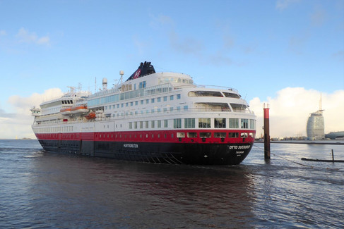 Bei Bredo Dry Docks in Bremerhaven konnten jetzt planmäßig die im Schwimmdock IV durchgeführten Wartungsarbeiten an dem Expeditionskreuzfahrtschiff „Otto Sverdrup“ (IMO 9231951) abgeschlossen werden. Am Donnerstagmorgen verlies das 138,5 Meter lange und bis zu 919 Gäste fassende Schiff von Hurtigruten die Seestadt und nahm Kurs auf Hamburg, wo am 19.01. die nächste Reise in Richtung Nordkap startet. Die 15-tägigen Norwegen-Expeditionsreisen, auf denen dann nach der Abreise in Hamburg inzwischen aber kein kurzer nächtlicher Stopp in Cuxhaven mehr eingelegt wird, führt entlang der norwegischen Küste. Ziel und Wendepunkt dieser Reisen ist der nördlichste Punkt Europas, das Nordkap.